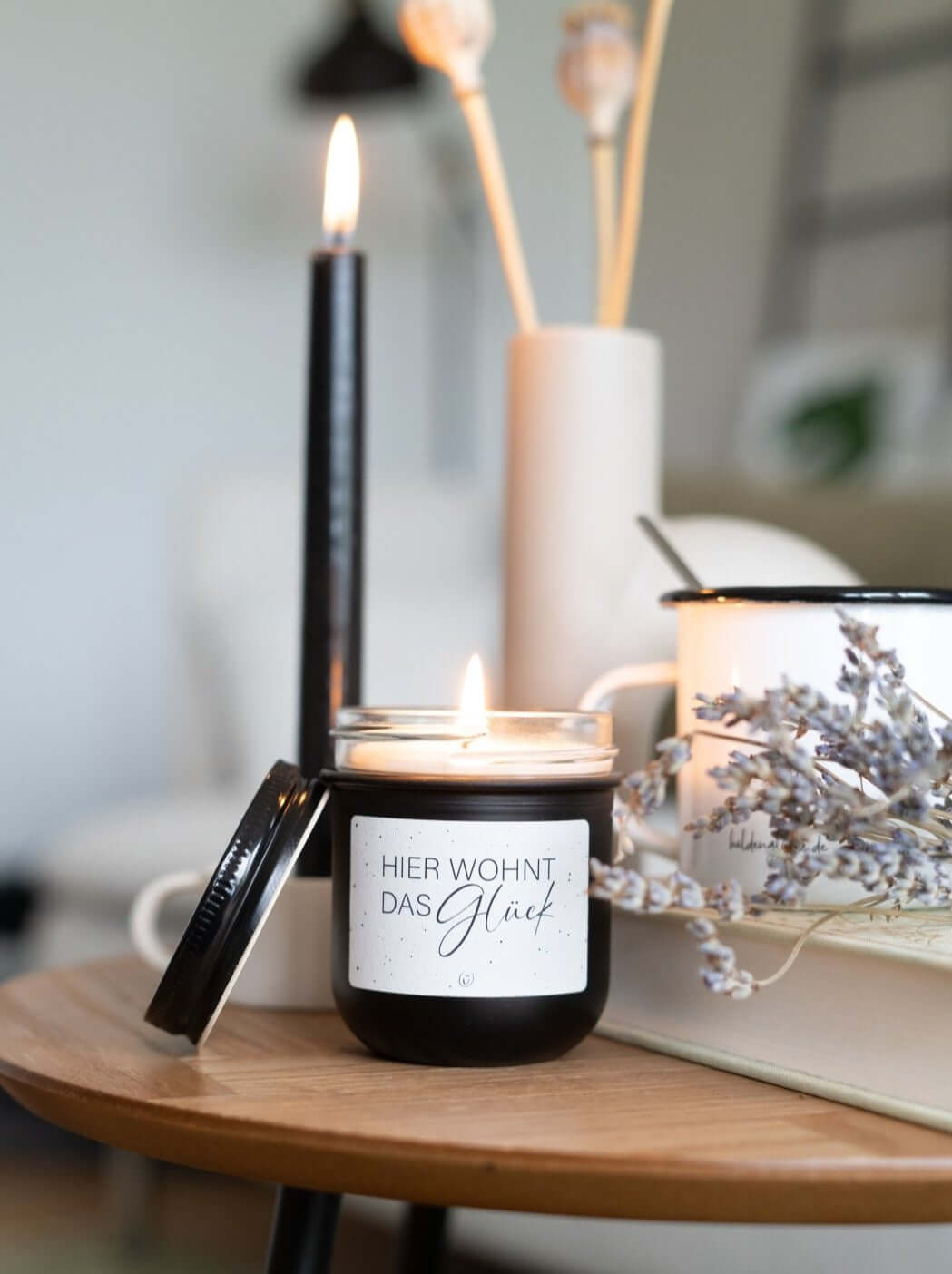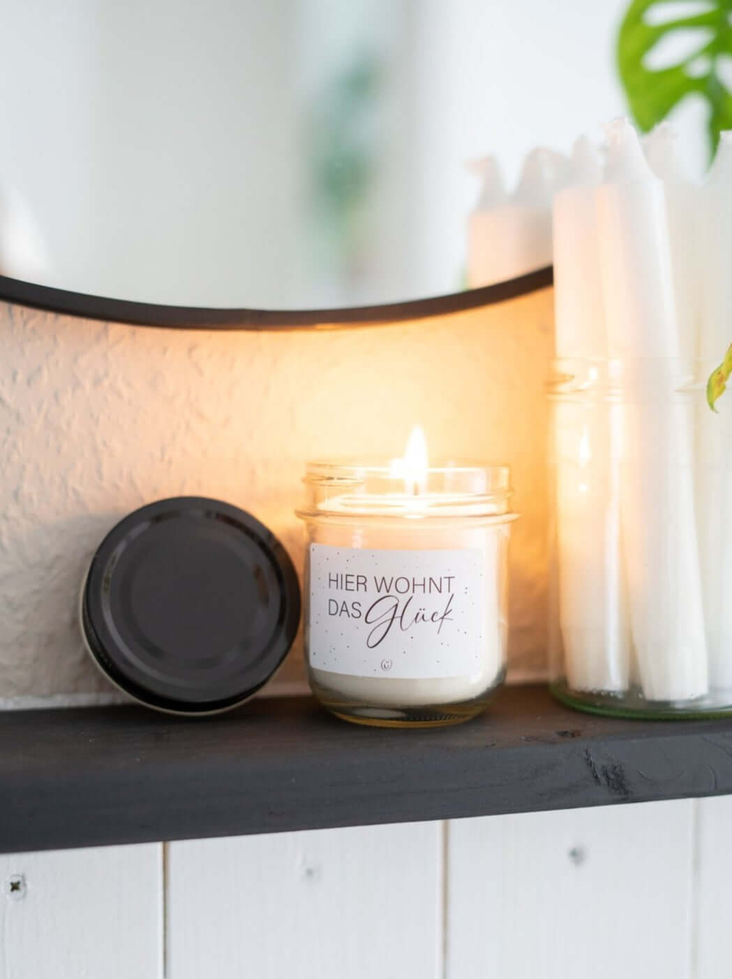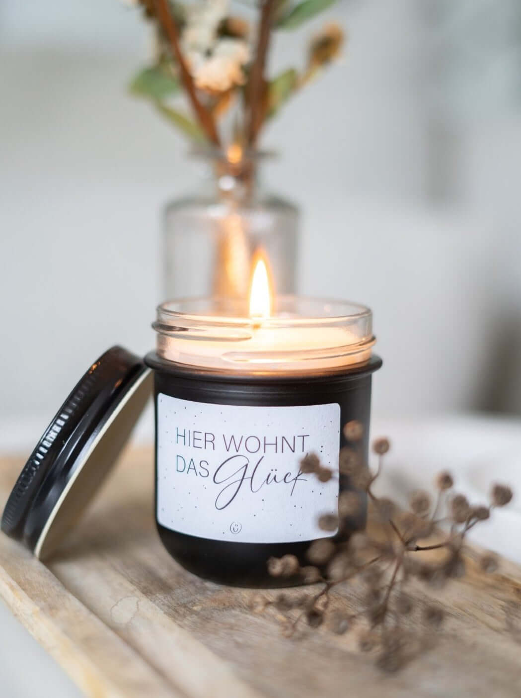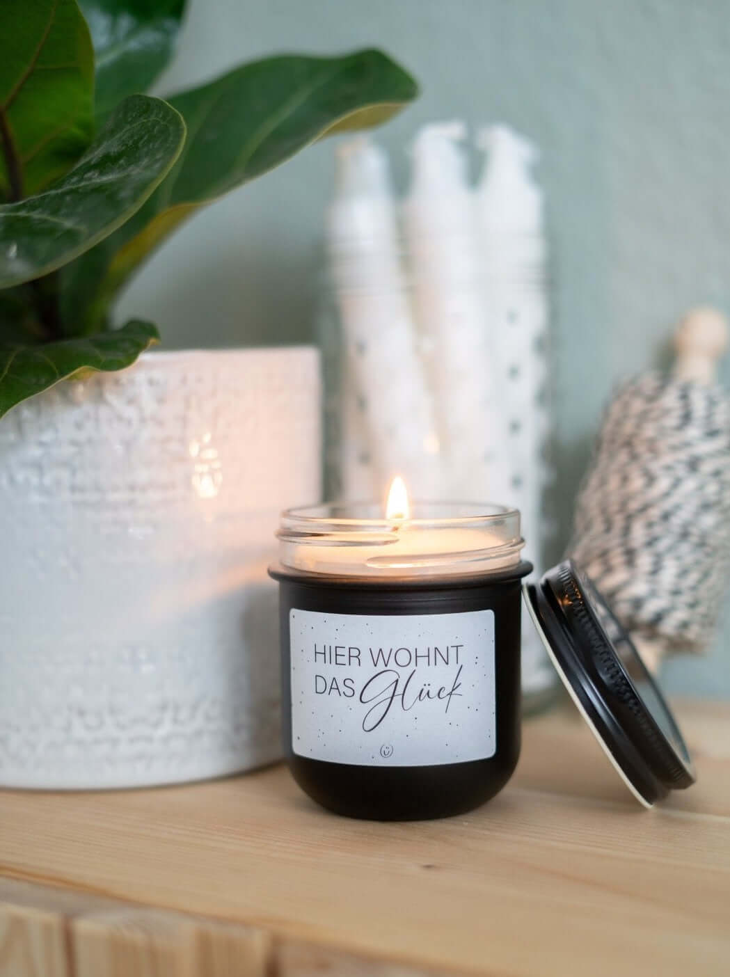 Vegane Kerze mit Spruch – „Hier wohnt das Glück“