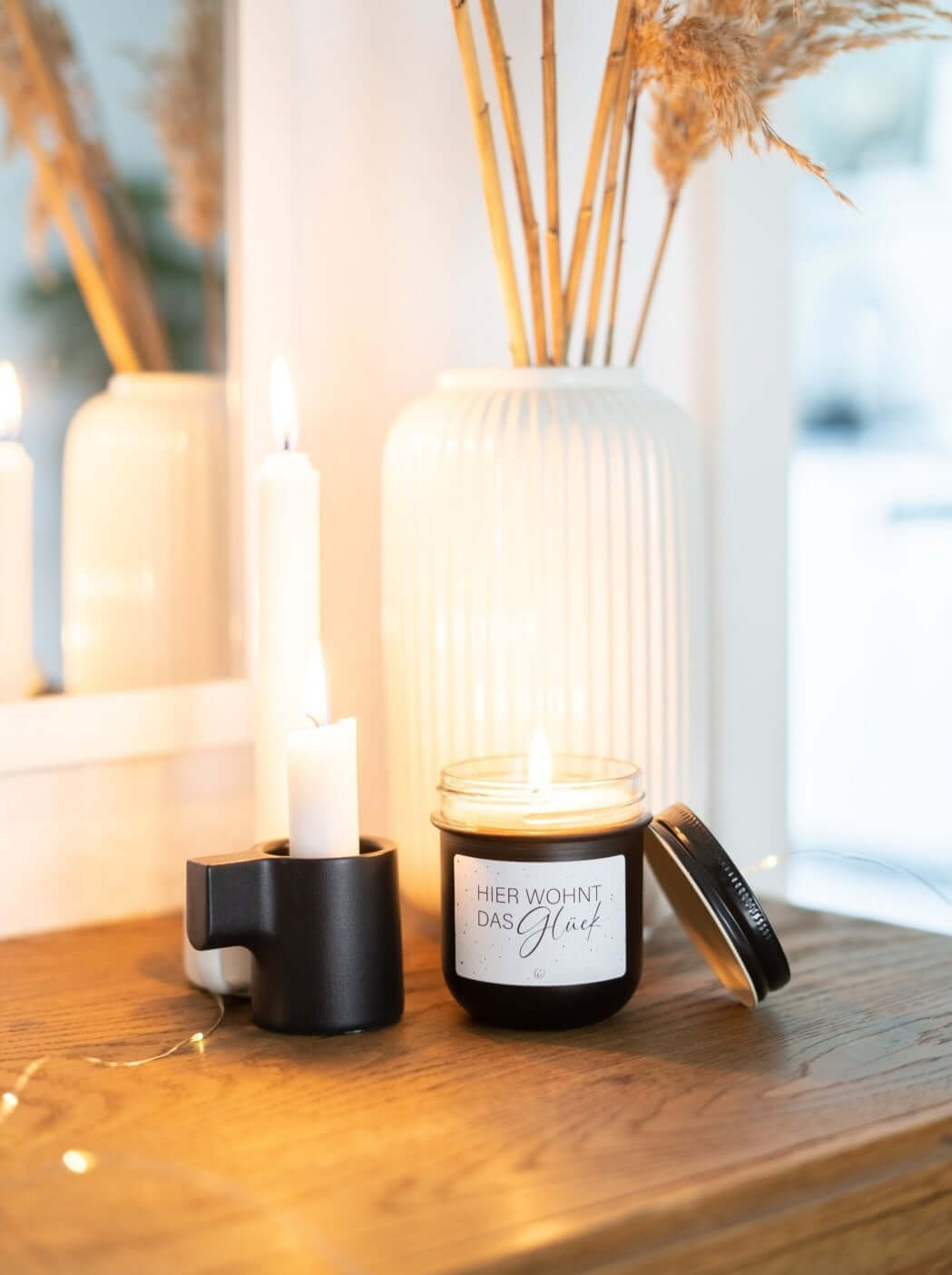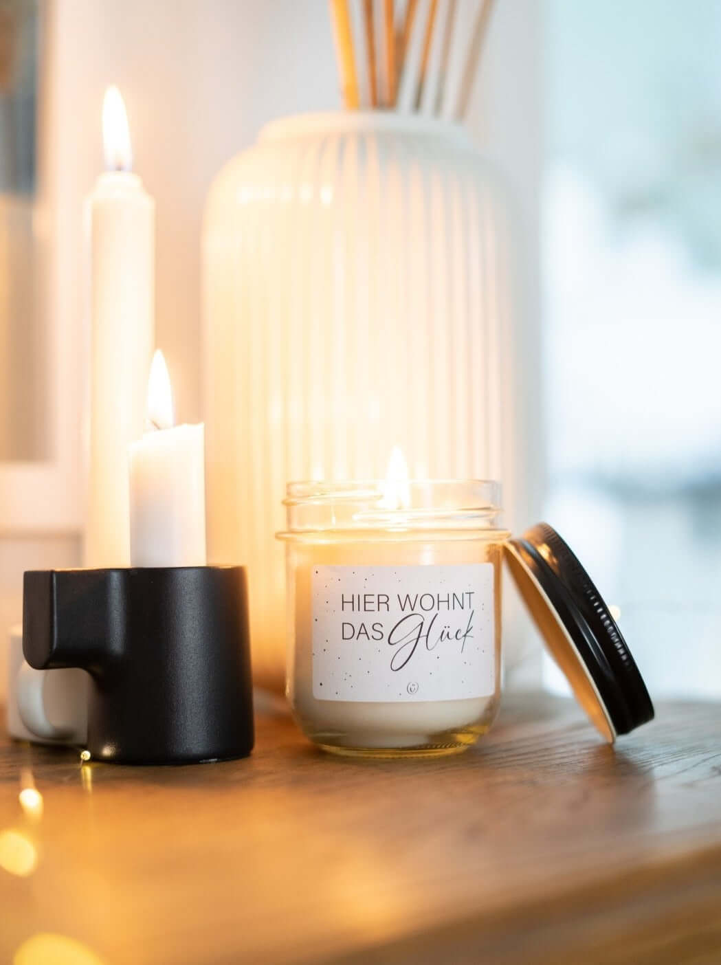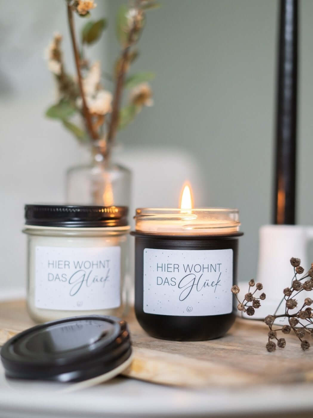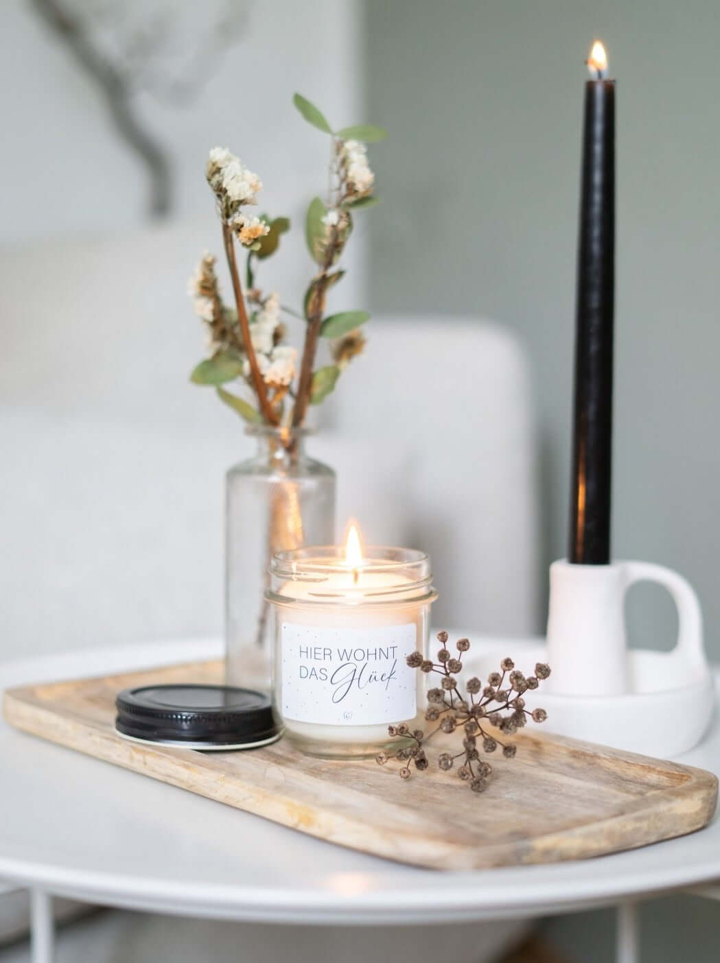 Vegane Kerze mit Spruch – „Hier wohnt das Glück“