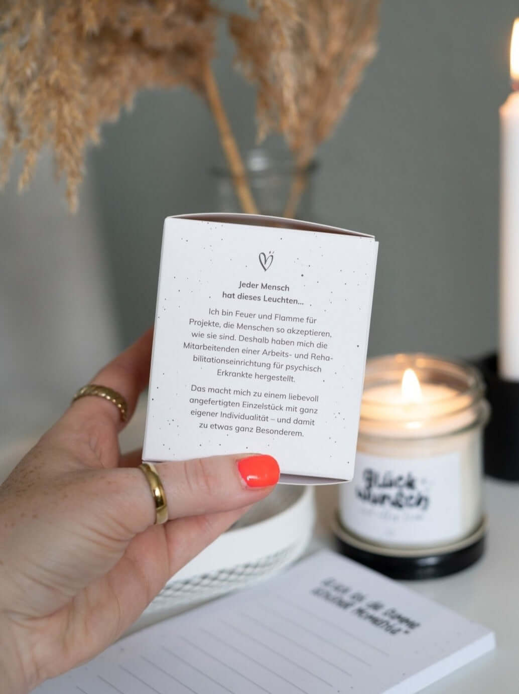 Ob als Geschenk zum Einzug, Mitbringsel für Freund:innen oder liebevolle Aufmerksamkeit für Menschen, die dir am Herzen liegen: Diese Kerze passt immer. Sie steht für Achtsamkeit, Nachhaltigkeit und ehrliche Verbundenheit – stilvoll verpackt in minimalistischem Design. Oft verschenkt, immer geschätzt. Und weil sie mit viel Sorgfalt in einer sozialen Einrichtung gefertigt wird, leuchtet sie gleich doppelt: für deine Liebsten – und für mehr Inklusion und Menschlichkeit.