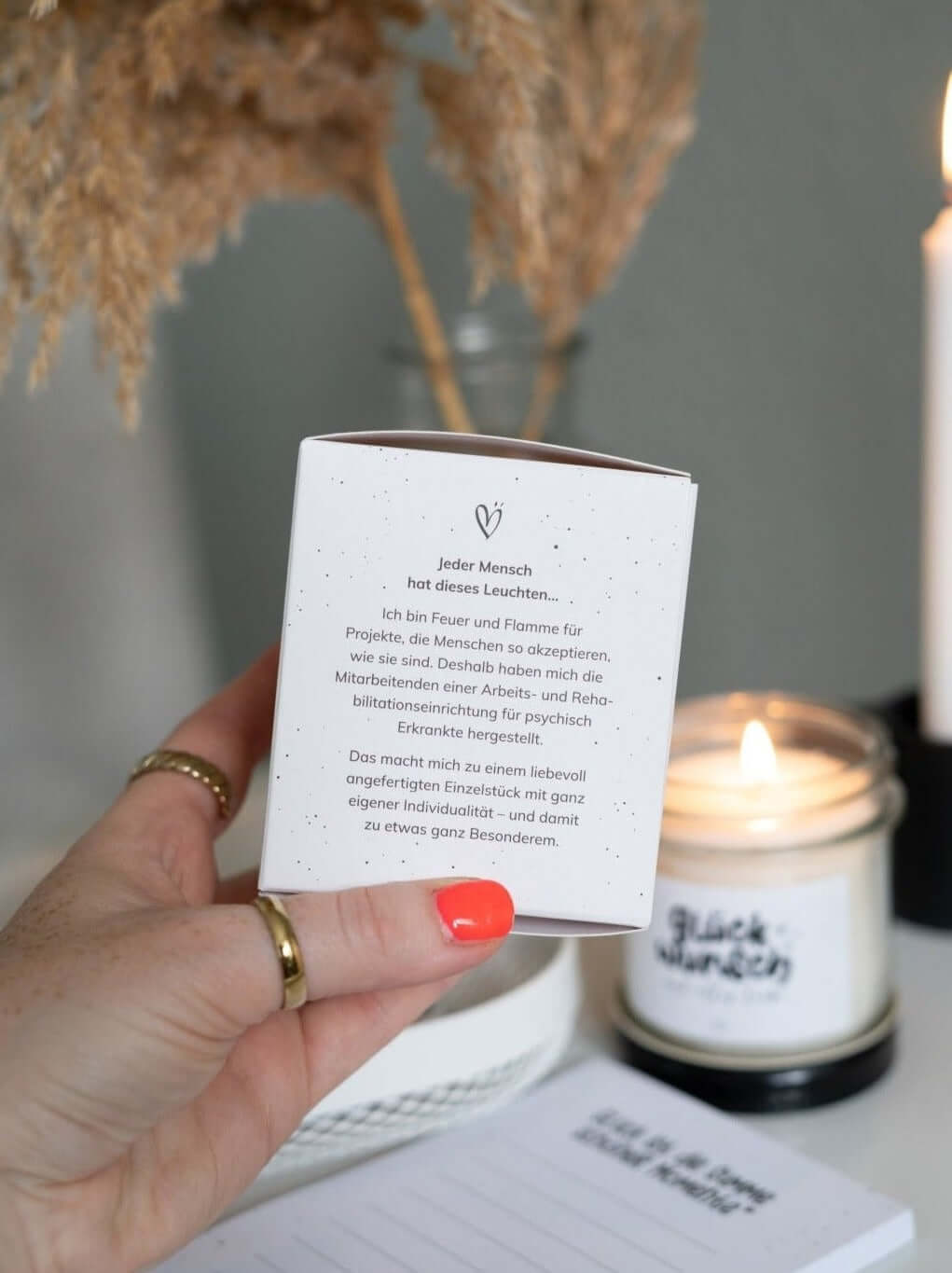Warum auf morgen warten, wenn jetzt der beste Moment ist? Diese vegane Kerze im Glas trägt den Spruch „Jetzt ist die beste Zeit“ – und genau das macht sie so besonders. Sie erinnert uns daran, wie wertvoll das Hier und Jetzt ist. Handgegossen in einer Inklusionswerkstatt in Deutschland, aus 100 % pflanzlichem Rapsöl und frei von Duft- und Farbstoffen, ist sie ein ehrliches Licht für kleine Gesten mit großer Wirkung. Viele Heldenglück-Kund:innen verschenken sie spontan – einfach so, um Freude zu machen. Für sich selbst oder für Menschen, die ein warmes Zeichen im Alltag verdienen.